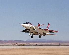 NASA Dryden Flight Research Center's F-15 ACTIVE (Advanced Control Technology for Integrated Vehicles) research aircraft takes off from Edwards, California. The twin-engine F-15 is equipped with new Pratt & Whitney nozzles that can turn up to 20 degrees in any direction, giving the aircraft thrust control in the pitch (up and down) and yaw (left and right) directions. On March 27, 1996, NASA began flight testing a new thrust vectoring concept on the F-15 research aircraft to improve performance and aircraft control. The new concept should lead to signifigant increases in performance of both civil and military aircraft flying at subsonic and supersonic speeds.