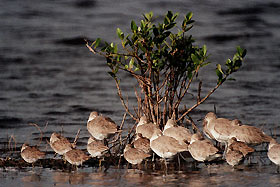 (01/20/2000) -- Willets gather around a plant in the shallow waters of the Merritt Island National Wildlife Refuge, which shares a boundary with Kennedy Space Center. Willets are best identified in flight by their black-and-white wing pattern; on the ground by their thick black bills and gray legs. They breed in southern Canada, the United States and the West Indies, wintering from the southern U.S. to central South America. The 92,000-acre refuge is a habitat for more than 330 species of birds, 31 mammals, 117 fishes and 65 amphibians and reptiles. The marshes and open water of the refuge provide wintering areas for 23 species of migratory waterfowl, as well as a year-round home for great blue herons, great egrets, wood storks, cormorants, brown pelicans and other species of marsh and shore birds