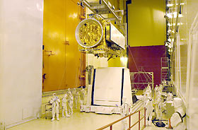 Title : The Aqua-EOS satellite is lifted by an overhead crane in the Spaceport Systems International (SSI