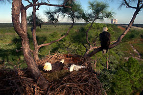 This is one in a series of remarkable photos documenting the daily lives of two of KSC's most famous residents: The Southern Bald Eagles which inhabit an enormous nest on the Kennedy Parkway North. Each fall, the eagles take up winter residence in the nest to breed and raise a new generation. Thanks to a remote-controlled Nikon camera installed yearly in the same pine tree as the nest, the activities of these magnificent birds are recorded on film. This year, a rare and unique event was captured by the camera when a second clutch of eggs was laid, even though a healthy eaglet was born a month earlier. Although it is impossible to determine if it is the same eagles returning each year, the continued tolerance shown by this pair to the human presence seems to indicate that they are the same couple. According to wildlife experts, eight to nine pairs of bald eagles inhabit nests at KSC. The nest on Kennedy Parkway North is particularly well-known because of its huge size and close proximity to a busy road.