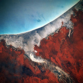 The coastal region in this image is the central part of Eighty Mile Beach. The beach and the surrounding mudflats and marshes are one of the most important migratory stop-over areas for shorebirds in East Asia and Australia and is included in the list of RAMSAR sites. The unpolluted waters off the beach host some of the world’s richest pearl beds. The actual beach width averages about 328 feet (100 meters), with a tidal range of about 20 feet (6 meters). Inland from the coast the sandy plains and ridges (parallel bands of alternating light and dark streaks) are covered by an assortment of grasses.