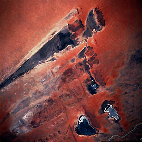 The five lakes in this low-oblique photograph comprise the northernmost extent of the inland delta of the Niger River in central Mali—distinctive Faguibine, very angular and spear-shaped; Komango, immediately east of Lake Faguibine; elongated, north-south-oriented Tele; kidney-shaped Oro; and Fati. Each lake has a channel connecting it with the more extensive inland delta; very little open water can be seen in any of the lakes. Some speculation exists about the formation of these lakes, but the most plausible explanation focuses on wind erosion. Recognizing that the prevailing wind direction is from the northeast and that elevated ridges of apparently more resistant rock outcrops lie northeast of each lake, it seems reasonable that the wind blowing over these ridges produced troughs by the scouring effect on the leeward side of the ridges. In the recent past, these troughs (now called lakes) filled with water, probably when the Niger River flooded. This entire area is part of the southern Sahara Desert; therefore, rainfall amounts are generally less than 4 inches (10 centimeters) annually. This region of Africa is suffering from a prolonged drought that extended from the late 1970s through the mid-1990s. A small section of the Niger River is visible at the southeastern corner of the photograph.